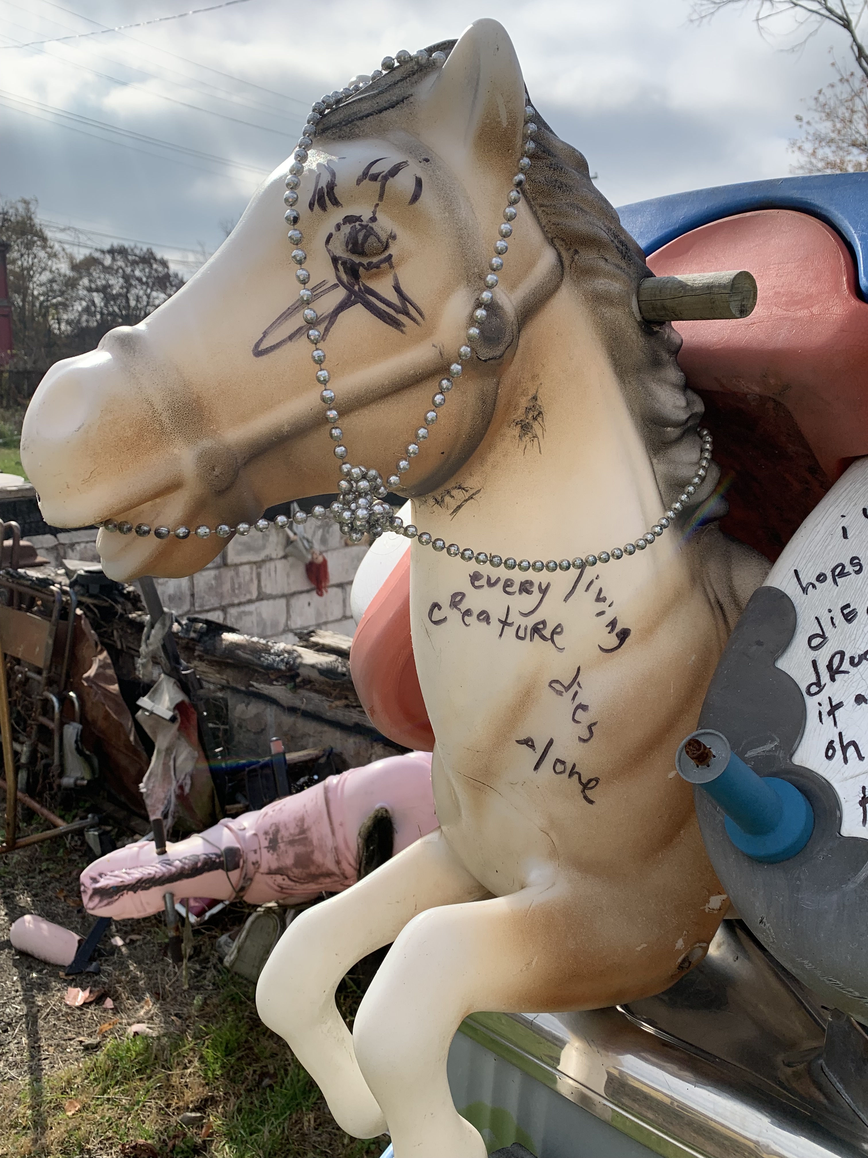 Like woven threads in the sweaters of the taxidermied mice at Brandon and Julie Howey‘s Wacky Taxidermy and Miniatures Museum, or a written-on rocking horse at Tyree Guyton‘s Heidelberg Project, you will find play and tragedy inextricably linked, impossible to separate.